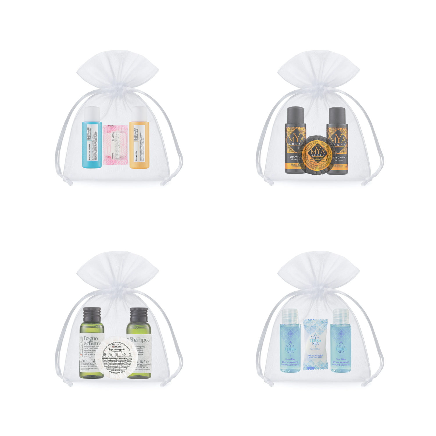 I nostri welcome kit sono pensati per rendere l’accoglienza semplice, elegante e professionale. Ogni set contiene i prodotti essenziali per gli ospiti, già confezionati in pratici sacchetti pronti all’uso: un modo rapido per rifornire il bagno e dare subito un’impressione di cura e attenzione ai dettagli. Formulazioni Made in Italy, dermatologicamente testate e packaging completamente riciclabili.